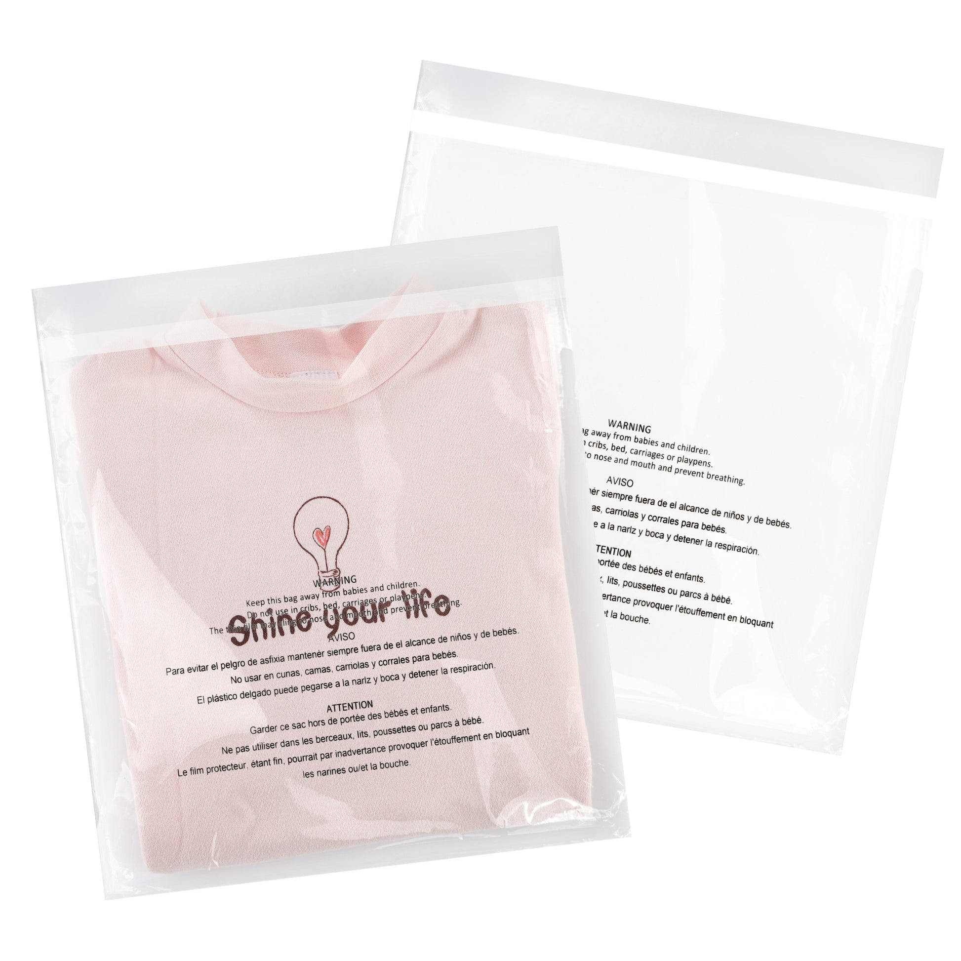 • Easy Peel & Seal: These warning bags let you peel off the adhesive strip in seconds, making packaging quick and easy. There’s no need for tape or impulse sealers, perfect for fast and efficient use.